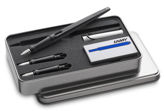 Набор для каллиграфии в металлической подарочной коробке. В комплекте: перьевая ручка для каллиграфии Lamy Joy с алюминиевым колпачком (перо 1.5), два сменных пишущих узла шириной - 1.1 и 1.9 мм и пять картриджей с чернилами.